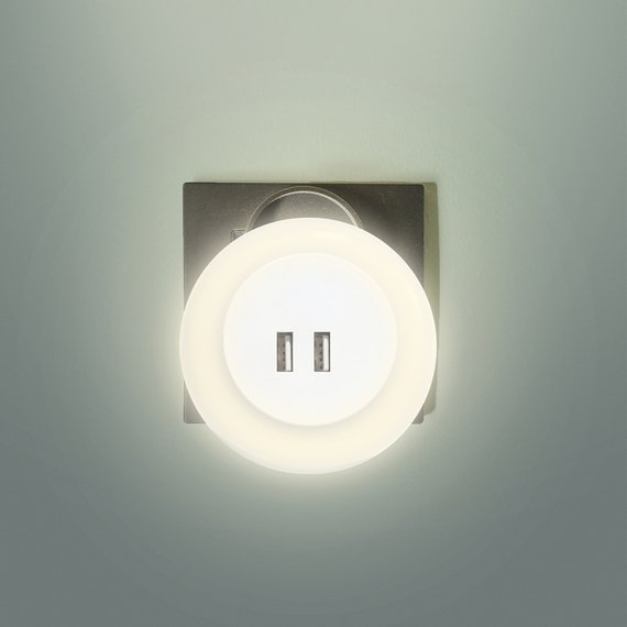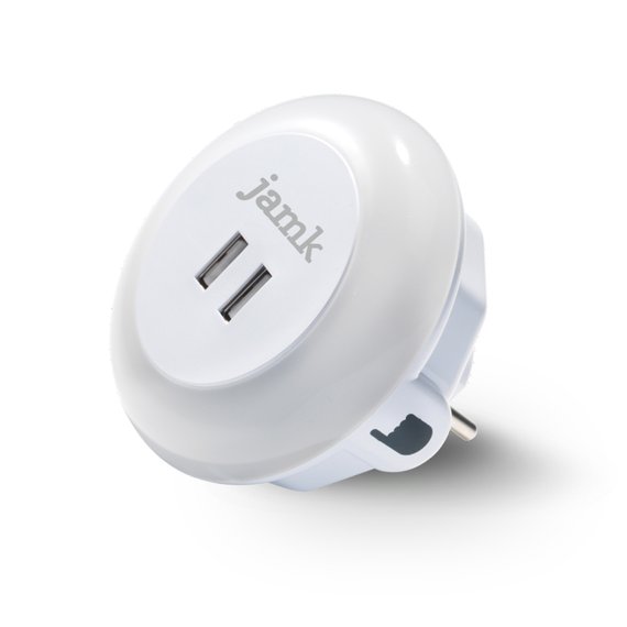 Sisäkäyttöön soveltuva pyöreä valkoinen yölamppu toimii myös laturina. Pehmeästi valaiseva 20 lm LED-lamppu sopii hyvin niin makuuhuoneeseen, portaisiin kuin eteiseen. Valaisin on äärimmäisen helppokäyttöinen: laite liitetään pistorasiaan ja laturit liitetään lampun etupuolella oleviin USB-portteihin. Kaksipaikkaisen laturin latausteho on max. 5 V / 2.1 A. JAMK kaiverrus.