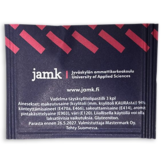 3 kpl ksylitolpastilleja pussissa. Maku vadelma. Pussin koko 68 x 50 mm.
